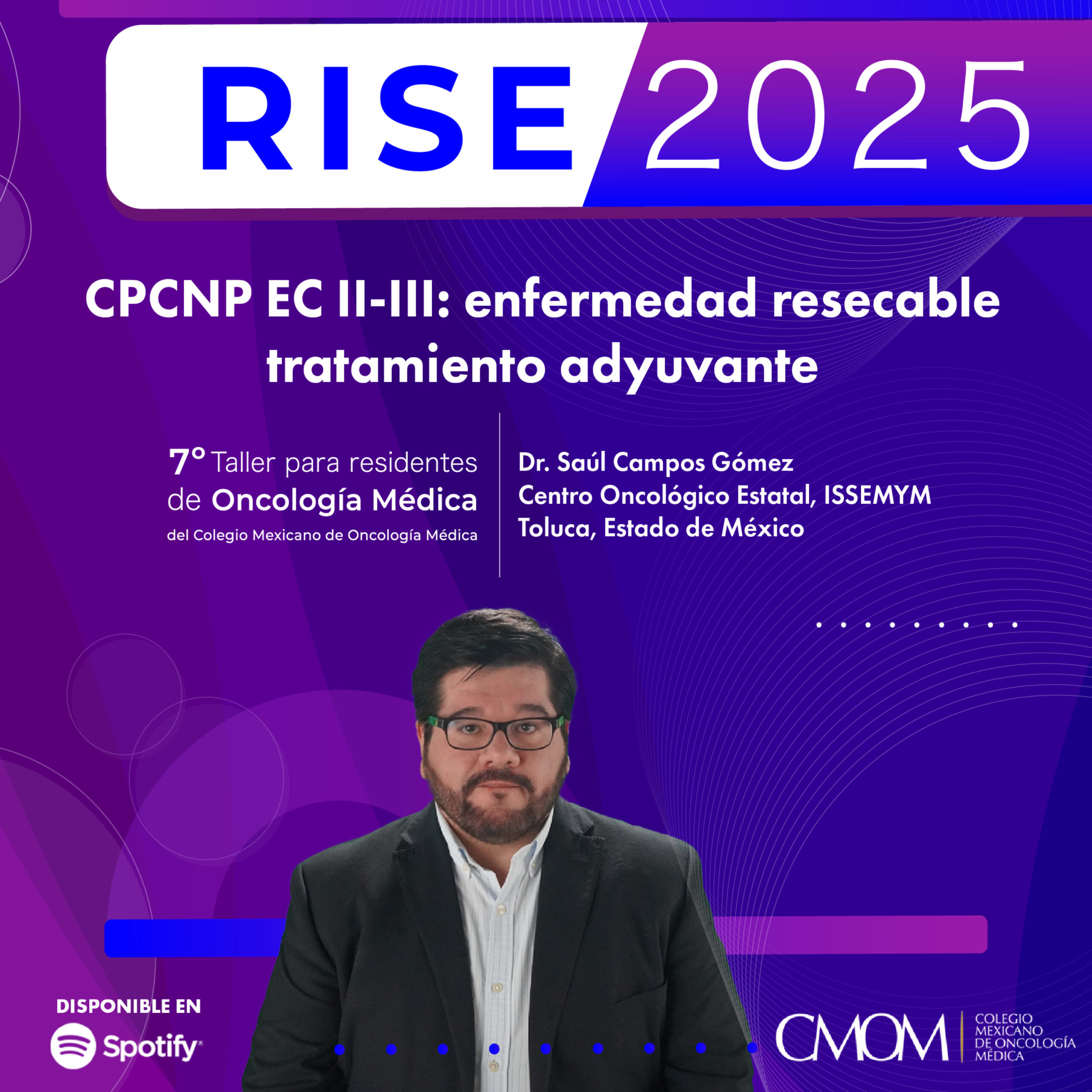 El Dr. Saúl Campos Gómez, oncólogo médico del Centro Oncológico Estatal, ISSEMYM en Toluca, Estado de México, nos habla durante el 7º Taller RISE 2025: Residents In Search of Excellence del Colegio Mexicano de Oncología Médica, sobre CPCNP EC II-III: enfermedad resecable tratamiento adyuvante.